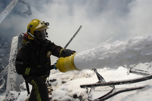 (2007-09-09)Fotografia de l'actuació d'un bomber amb mànega en un incendi d'una indústria a Vallirana. -