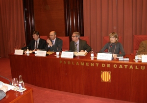 (2008-03-27)Fotografia d'una taula presidencial al Parlament de Catalunya amb el conseller del Departament d'Interior, Relacions Institucionals i Participació Joan Saura, Joan Delort i Menal, Joan Boada i Masoliver ...