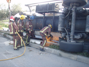 (2006-11-28)Fotografies d'un simulacre amb la intervenció de Bombers dins el pla especial d'emergències per accidents en el transport de mercaderies perilloses per carretera i ferrocarril a Catalunya (TRANSCAT). -
