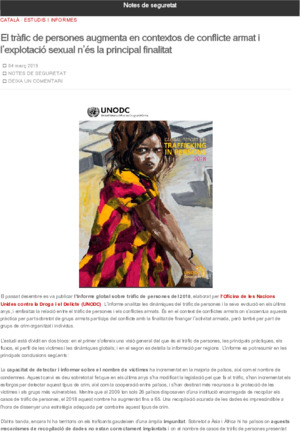 Departament d'Interior (Publicat dins el Blog Notes de seguretat https://notesdeseguretat.blog.gencat.cat/, 2019-03-04)Nota informativa sobre la conclusió de que el tràfic de persones augmenta en contextos de conflicte armat i l’explotació sexual n’és la principal finalitat, segons l’Informe global sobre tràfic de ... -