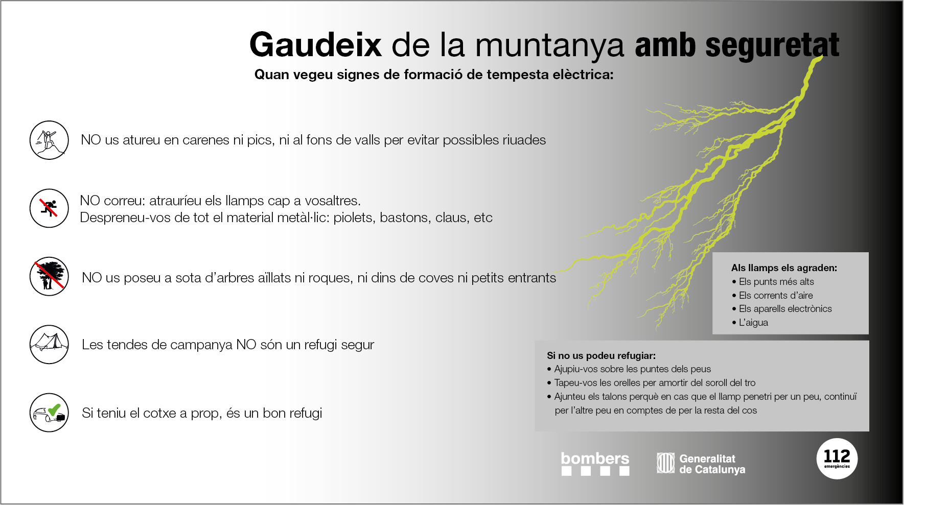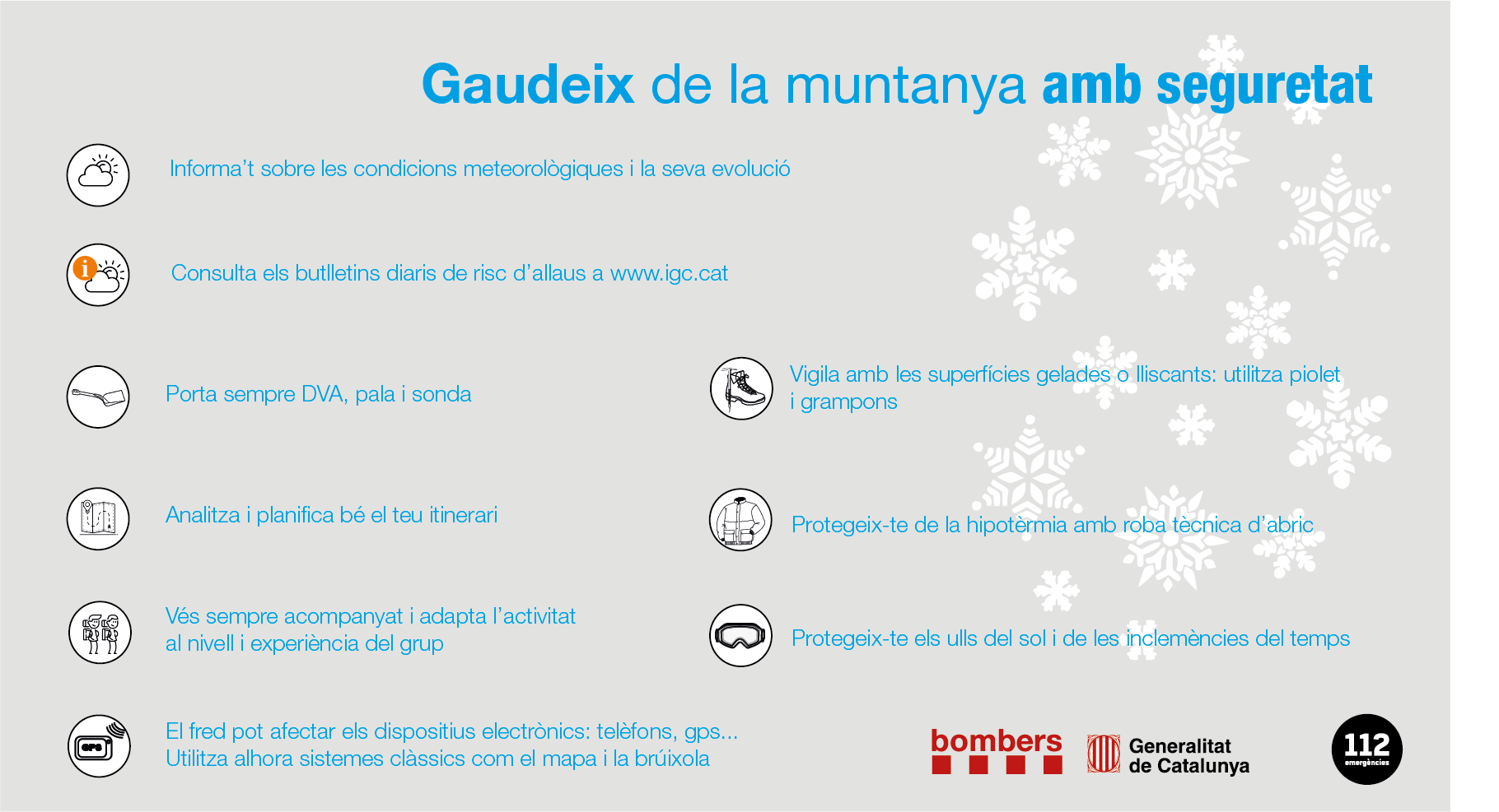 Infografies amb consells de protecció i seguretat a la muntanya de manera genèrica i en diverses situacions: aigües interiors, allaus, barranquisme, boletaires, neu i tempesta elèctrica.Citación recomendada