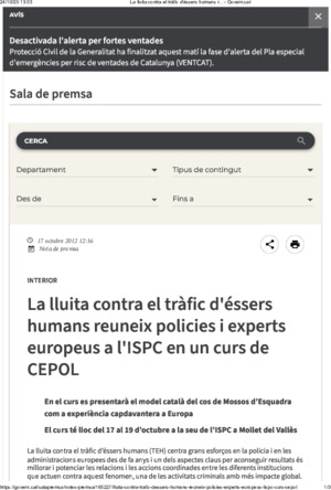 Curs sobre la lluita contra el tràfic d'éssers humans, celebrat el 17, 18 i 19 d'octubre de 2012. Un dels aspectes claus per aconseguir resultats, és millorar i potenciar les accions coordinades entre les institucions que actuen contra aquest fenomen. El curs s'ha finançat amb fons de l'Escola Europea de Policia (CEPOL) i l'Institut de Seguretat Pública de Catalunya n'és l'organitzador. En aquesta activitat formativa han participat 25 policies i experts de divuit països europeus: Bulgària, República Txeca, Dinamarca, Estònia, França, Grècia, Hongria, Islàndia, Letònia, Lituània, Malta, Noruega, Polònia, Portugal, Romania, Regne Unit i Espanya (Cos Nacional de Policia i Policia de la Generalitat-Mossos d'Esquadra).Citación recomendada