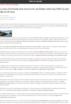 Departament d'Interior (Publicat dins el Blog Notes de seguretat https://notesdeseguretat.blog.gencat.cat/, 2022-06-01)Nota informativa sobre com la taxa d’homicidis relacionats amb armes de foc als Estats Units va assolir el seu nivell més alt en més de 25 anys el 2020 i com els experts no han sabut trobar-hi una explicació. -