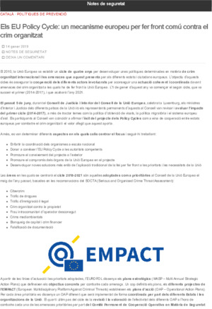 Departament d'Interior (Publicat dins el Blog Notes de seguretat https://notesdeseguretat.blog.gencat.cat/, 2019-01-14)Nota informativa sobre els Policy Cycles com a eina de cooperació entre estats europeus per combatre el crim organitzat i el valor afegit que aquest aporta. -
