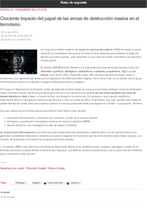 Departament d'Interior. Impacte creixent del paper de les armes de destrucció massiva en el terrorisme. En: Notes de Seguretat (Blog) <https://notesdeseguretat.blog.gencat.cat>. Barcelona: Departament d'Interior, 2018. 2 p.