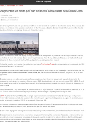 Departament d'Interior i Seguretat Pública (Publicat dins el Blog Notes de seguretat https://notesdeseguretat.blog.gencat.cat/, 2025-02-03)Nota informativa sobre l’augment de les morts pel ‘surf del metro’ a les ciutats dels Estats Units. -
