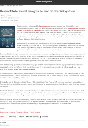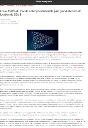Departament d'Interior. Les autoritats de tot el món persegueixen el lloc web més gran de lloguer de DdoS. En: Notes de Seguretat (Blog) <https://notesdeseguretat.blog.gencat.cat>. Barcelona: Departament d'Interior, 2019. 2 p.