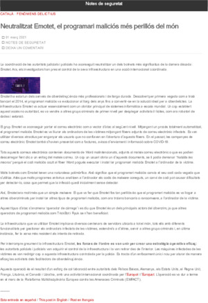 Departament d'Interior (Publicat dins el Blog Notes de seguretat https://notesdeseguretat.blog.gencat.cat/, 2021-03-01)Nota informativa sobre com la coordinació de les autoritats judicials i policials ha aconseguit neutralitzar un dels botnets més significatius de la darrera dècada: Emotet. Els investigadors han pres ... -