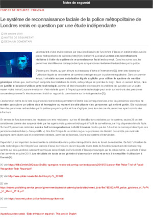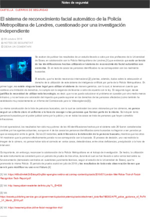 Departament d'Interior. El sistema de reconeixement facial automàtic de la Policia Metropolitana de Londres, qüestionat per una recerca independent. En: Notes de Seguretat (Blog) <https://notesdeseguretat.blog.gencat.cat>. Barcelona: Departament d'Interior, 2019. 2 p.