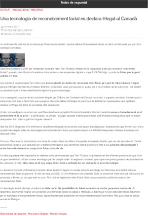 Departament d'Interior (Publicat dins el Blog Notes de seguretat https://notesdeseguretat.blog.gencat.cat/, 2021-03-24)Nota informativa sobre que les autoritats canadenques han trobat que la recopilació de dades de reconeixement facial per part de Clearview és il·legal.