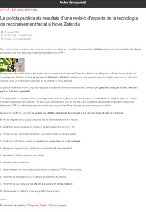 Departament d'Interior (Publicat dins el Blog Notes de seguretat https://notesdeseguretat.blog.gencat.cat/, 2022-01-31)Nota informativa sobre com una revisió d’experts independent ha proporcionat a la policia de Nova Zelanda consells detallats sobre les oportunitats i els riscos associats a l’ús de la tecnologia de ... -