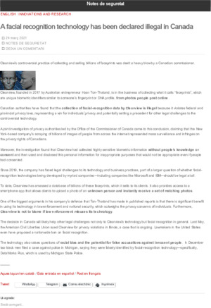 Nota informativa sobre que les autoritats canadenques han trobat que la recopilació de dades de reconeixement facial per part de Clearview és il·legal.Recommended citation