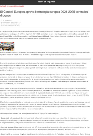 Departament d'Interior (Publicat dins el Blog Notes de seguretat https://notesdeseguretat.blog.gencat.cat/, 2021-01-18)Nota informativa sobre l’aprovació del Consell Europeu de l’estratègia de la Unió Europea que estableix el marc polític i les prioritats de la política contra les drogues de la UE en el període 2021-2025. -