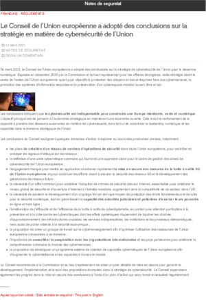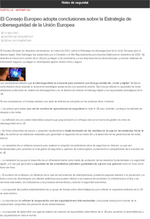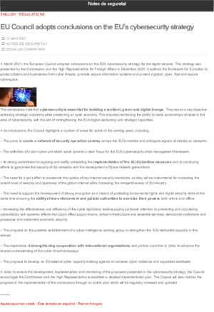 Departament d'Interior. El Consell Europeu adopta conclusions sobre l’Estratègia de ciberseguretat de la Unió Europea. En: Notes de Seguretat (Blog) <https://notesdeseguretat.blog.gencat.cat>. Barcelona: Departament d'Interior, 2021. 2 p.