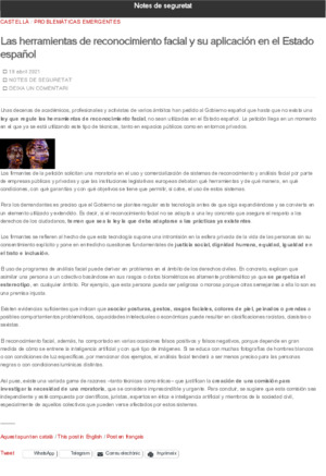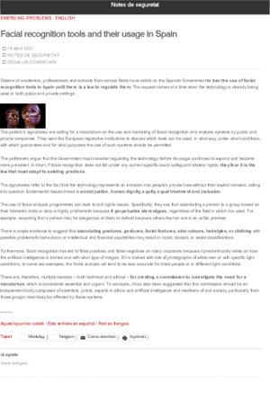 Nota informativa sobre la petició d’unes desenes d’acadèmics, professionals i activistes de diversos àmbits al Govern espanyol que fins que no hi hagi una llei que reguli les eines de reconeixement facial, no siguin utilitzades a l’Estat espanyol. La petició arriba en un moment en què ja s’està utilitzant aquest tipus de tècniques, tant en espais públics com en entorns privats.Citación recomendada