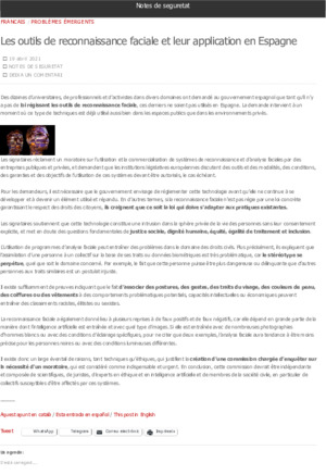 Departament d'Interior. Les eines de reconeixement facial i la seva aplicació a l’Estat espanyol. En: Notes de Seguretat (Blog) <https://notesdeseguretat.blog.gencat.cat>. Barcelona: Departament d'Interior, 2021. 2 p.