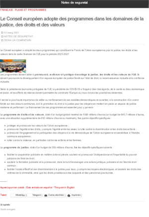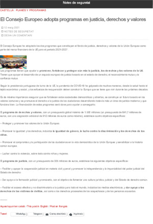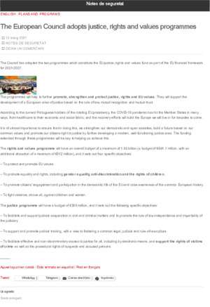 Departament d'Interior. El Consell Europeu adopta programes en justícia, drets i valors. En: Notes de Seguretat (Blog) <https://notesdeseguretat.blog.gencat.cat>. Barcelona: Departament d'Interior, 2021. 2 p.
