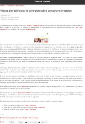 Departament d’Interior (Publicat dins el Blog Notes de seguretat https://notesdeseguretat.blog.gencat.cat/, 2017-04-03)Nota informativa sobre el llançament a Suècia de la campanya “No tracti d’enganyar-me”, per informar i formar la gent gran sobre com es poden protegir de fraus i estafes.