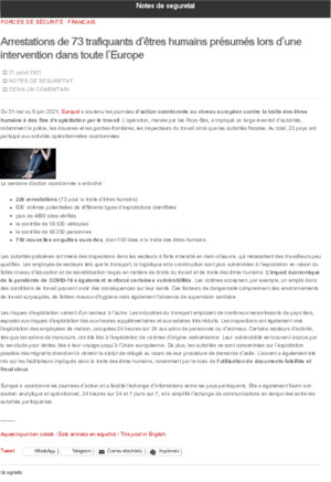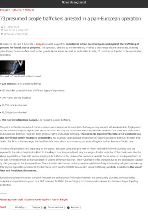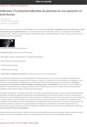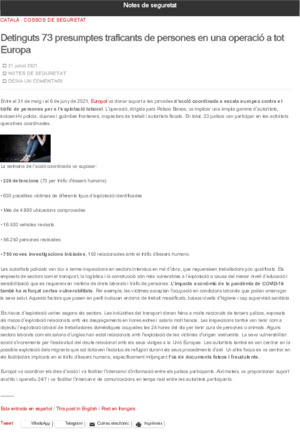 Departament d'Interior. Detinguts 73 presumptes traficants de persones en una operació a tot Europa. En: Notes de Seguretat (Blog) <https://notesdeseguretat.blog.gencat.cat>. Barcelona: Departament d'Interior, 2021. 2 p.