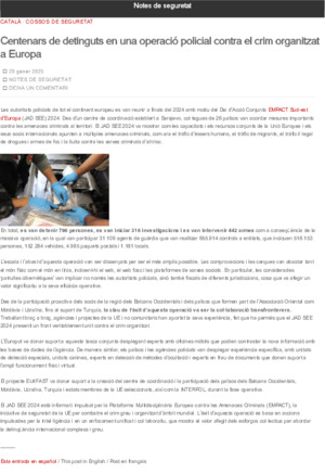Departament d'Interior i Seguretat Pública (Publicat dins el Blog Notes de seguretat https://notesdeseguretat.blog.gencat.cat/, 2025-01-20)Nota informativa sobre JAD SEE 2024, informat i impulsat per la Plataforma Multidisciplinària Europea contra les Amenaces Criminals (EMPACT), la iniciativa de seguretat de la UE per combatre el crim ... -