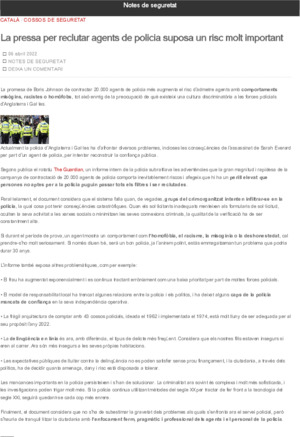 Departament d'Interior (Publicat dins el Blog Notes de seguretat https://notesdeseguretat.blog.gencat.cat/, 2022-04-06)Nota informativa sobre com la rapidesa de contractació de 20.000 agents de policia anglesa comporta inevitablement riscos i que hi ha un perill elevat que persones no aptes per a la policia puguin passar ...