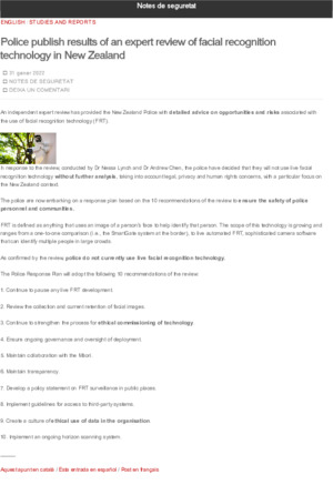 Departament d'Interior. La policia publica els resultats d’una revisió d’experts de la tecnologia de reconeixement facial a Nova Zelanda. En: Notes de Seguretat (Blog) <https://notesdeseguretat.blog.gencat.cat>. Barcelona: Departament d'Interior, 2022. 2 p.