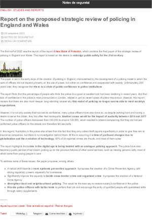 Nota informativa sobre l’informe presentat durant el primer semestre de 2022: «Un nou model de protecció», que recull el document final de la revisió estratègica de la policia a Anglaterra i Gal·les. L’informe es basa en la voluntat de redissenyar la seguretat pública per al segle XXI.Recommended citation