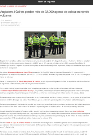 Departament d’Interior (Publicat dins el Blog Notes de seguretat https://notesdeseguretat.blog.gencat.cat/, 2018-04-09)Nota informativa sobre la pèrdua de més de 22.000 agents de policia a Anglaterra i Gal·les en vuit anys. -