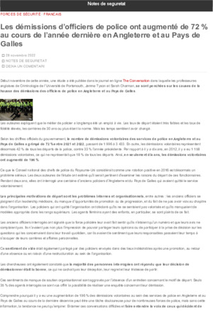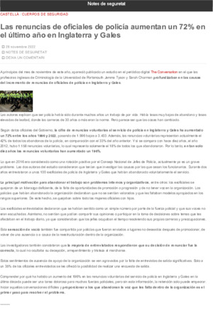 Departament d'Interior. Les renúncies d’oficials de policia augmenten un 72% el darrer any a Anglaterra i Gal·les. En: Notes de Seguretat (Blog) <https://notesdeseguretat.blog.gencat.cat>. Barcelona: Departament d'Interior, 2022. 2 p.