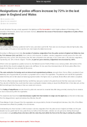 Nota informativa sobre un estudi al diari digital The Conversation en el qual les professores angleses de Criminologia de la Universitat de Portsmouth Jemma Tyson i Sarah Charman aprofundeixen en les causes de l’increment de renúncies d’oficials de policia a Anglaterra i Gal·les.Recommended citation