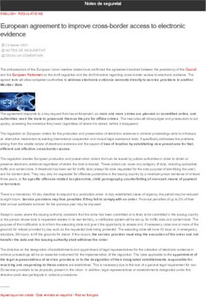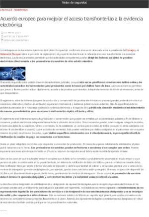Departament d'Interior. Acord europeu per millorar l’accés transfronterer a l’evidència electrònica. En: Notes de Seguretat (Blog) <https://notesdeseguretat.blog.gencat.cat>. Barcelona: Departament d'Interior, 2023. 2 p.