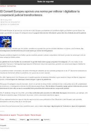 Departament d'Interior (Publicat dins el Blog Notes de seguretat https://notesdeseguretat.blog.gencat.cat/, 2023-05-10)Nota informativa sobre com el Consell Europeu ha aprovat una nova llei de la Unió Europea que estableix una plataforma digital que facilitarà que els fiscals i els jutges que treballin en equips ... -