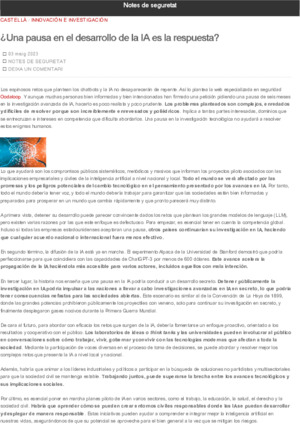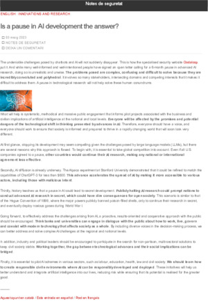 Departament d'Interior. Una pausa en el desenvolupament de la IA és la resposta? En: Notes de Seguretat (Blog) <https://notesdeseguretat.blog.gencat.cat>. Barcelona: Departament d'Interior, 2023. 2 p.