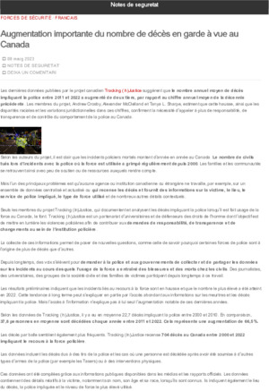 Nota informativa sobre les darreres dades publicades pel projecte Tracking (In)Justice del Canadà que suggereixen que el nombre mitjà anual de morts amb implicació de la policia entre els anys 2011 i 2022 va augmentar en dos terços, en comparació amb la xifra mitjana anual de la dècada anterior.Citació recomanada