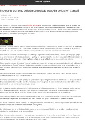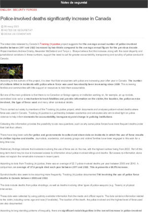 Departament d'Interior. Important augment de les morts sota custòdia policial al Canadà. En: Notes de Seguretat (Blog) <https://notesdeseguretat.blog.gencat.cat>. Barcelona: Departament d'Interior, 2023. 2 p.