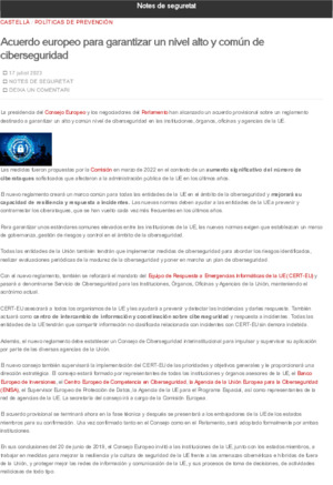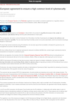 Departament d'Interior. Acord europeu per garantir un nivell alt i comú de ciberseguretat. En: Notes de Seguretat (Blog) <https://notesdeseguretat.blog.gencat.cat>. Barcelona: Departament d'Interior, 2023. 2 p.