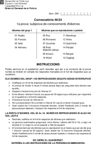 Direcció General de la Policia (2023)Model i solucionari de les proves de coneixements i coneixements d'idiomes utilitzada a la convocatòria de Mosso/a de l'escala bàsica del cos de Mossos d'Esquadra 46/23. -