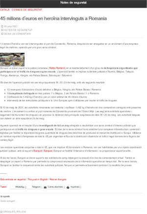 Departament d'Interior (Publicat dins el Blog Notes de seguretat https://notesdeseguretat.blog.gencat.cat/, 2021-06-30)Nota informativa sobre com Europol va donar suport a la policia romanesa en el desmantellament d’un grup de delinqüència organitzada que participava en el tràfic de drogues a gran escala. L’operació ... -