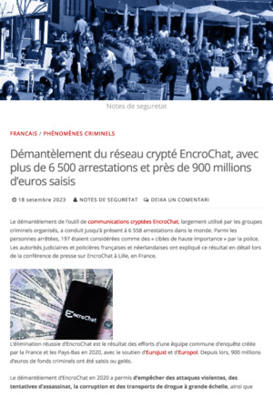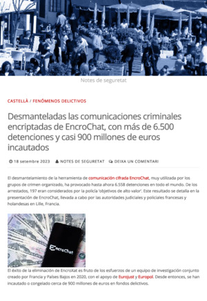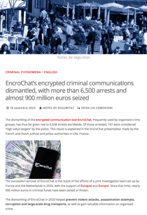 Departament d'Interior. Desmantellades les comunicacions criminals encriptades d’EncroXat, amb més de 6.500 detencions i gairebé 900 milions d’euros confiscats. En: Notes de Seguretat (Blog) <https://notesdeseguretat.blog.gencat.cat>. Barcelona: Departament d'Interior, 2023. 2 p.