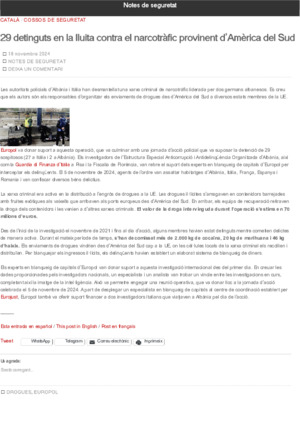 Departament d'Interior i Seguretat Pública (Publicat dins el Blog Notes de seguretat https://notesdeseguretat.blog.gencat.cat/, 2024-11-18)Nota informativa sobre com les autoritats policials d’Albània i Itàlia han desmantellat una xarxa criminal de narcotràfic liderada per dos germans albanesos. Es creu que els autors són els responsables ...