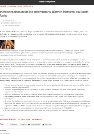 Departament d'Interior (Publicat dins el Blog Notes de seguretat https://notesdeseguretat.blog.gencat.cat/, 2021-10-06)Nota informativa sobre l’increment d’armes fantasma als Estats Units, on es poden comprar peces i kits de pistoles fantasma en línia sense estar subjectes a la majoria de les regulacions sobre armes de ... -