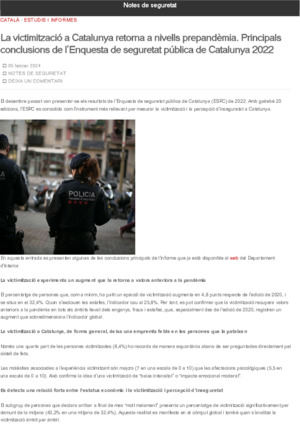 Departament d'Interior (Publicat dins el Blog Notes de seguretat https://notesdeseguretat.blog.gencat.cat/, 2024-02-05)Nota informativa sobre com segons els resultats de l’Enquesta de seguretat pública de Catalunya (ESPC) de 2022 la victimització a Catalunya retorna a nivells prepandèmia. -