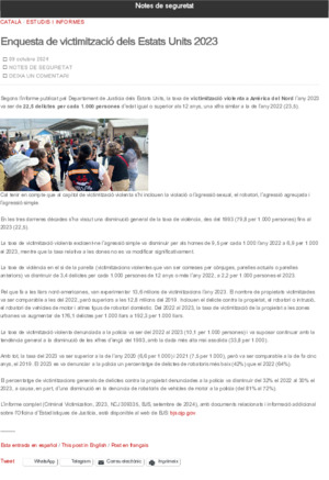 Departament d'Interior i Seguretat Pública (Publicat dins el Blog Notes de seguretat https://notesdeseguretat.blog.gencat.cat/, 2024-10-09)Nota informativa sobre l’informe, publicat pel Departament de Justícia dels Estats Units, de la taxa de victimització violenta a Amèrica del Nord l’any 2023. -