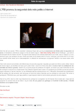 Departament d'Interior (Publicat dins el Blog Notes de seguretat https://notesdeseguretat.blog.gencat.cat/, 2017-10-23)Nota informativa sobre l’espai web de l’FBI que vol conscienciar els infants i adolescents sobre la seguretat a Internet.