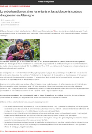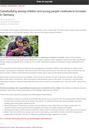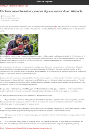 Departament d'Interior i Seguretat Pública. El ciberassetjament entre nens i joves segueix augmentant a Alemanya. En: Notes de Seguretat (Blog) <https://notesdeseguretat.blog.gencat.cat>. Barcelona: Departament d'Interior i Seguretat Pública, 2024. 2 p.