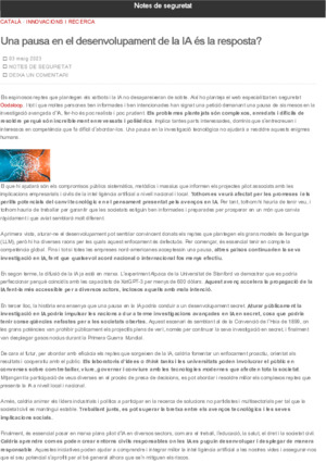 Departament d'Interior (Publicat dins el Blog Notes de seguretat https://notesdeseguretat.blog.gencat.cat/, 2023-05-03)Nota informativa que reflexiona si una pausa en la investigació avançada d’IA serviria per resoldre els reptes que plantegen, tal i com demanen experts en el tema.