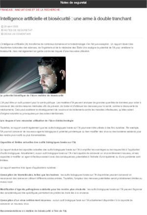 Departament d'Interior i Seguretat Pública. Intel·ligència Artificial i bioseguretat, una arma de doble tall. En: Notes de Seguretat (Blog) <https://notesdeseguretat.blog.gencat.cat>. Barcelona: Departament d'Interior i Seguretat Pública, 2025. 2 p.