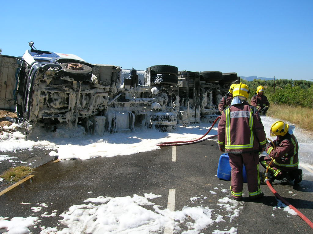 Fotografia d'un camió amb mercaderia perillosa accidentat a Horta de Sant Joan amb la intervenció de Bombers dins el pla especial d'emergències per accidents en el transport de mercaderies perilloses per carretera i ferrocarril a Catalunya (TRANSCAT).Recommended citation