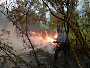 Fotografia d'un bomber amb una mànega i un agent forestal actuant en un incendi forestal a Rajadell.Recommended citation