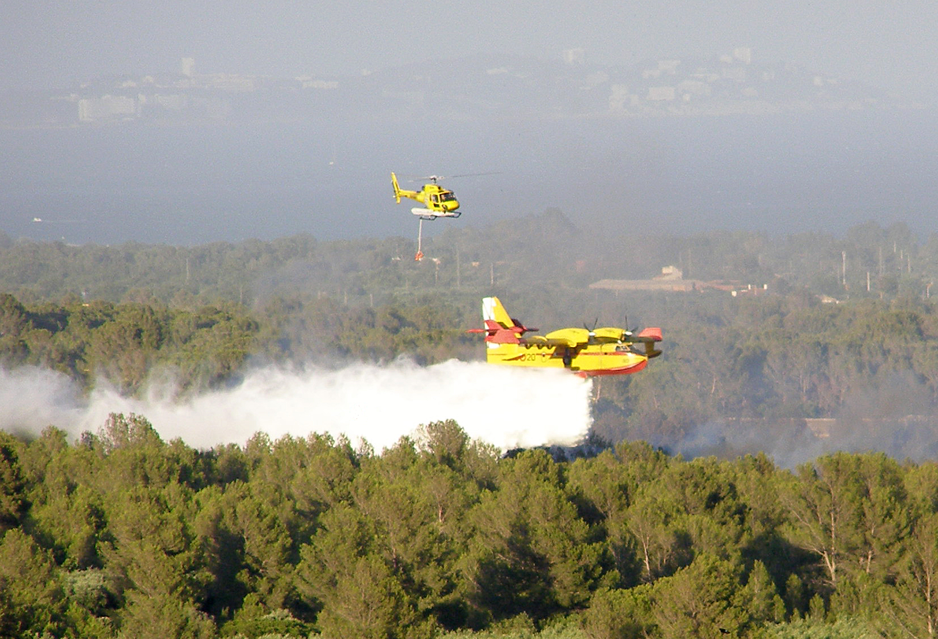 Fotografies d'un incendi forestal a Mont-roig del Camp, un avió cisterna i un helicòpter de Bombers fent tasques d'extinció.Recommended citation